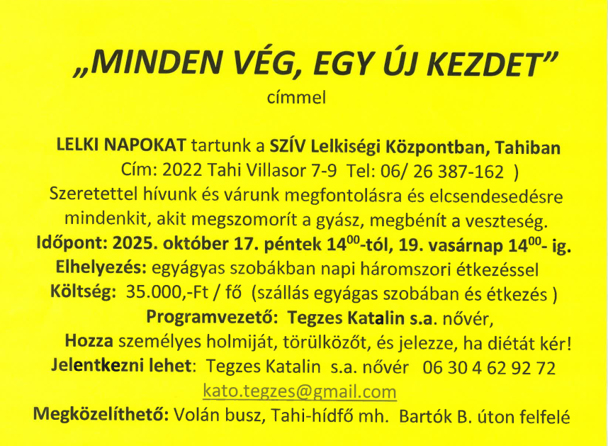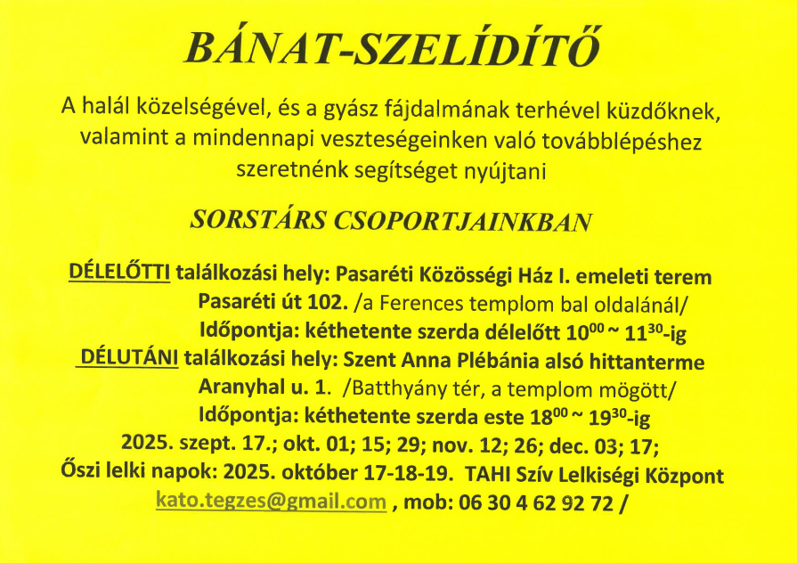 Szeretettel hívunk és várunk megfontolásra és elcsendesedésre mindenkit, akit megszomorít a gyász, megbénít a veszteség.