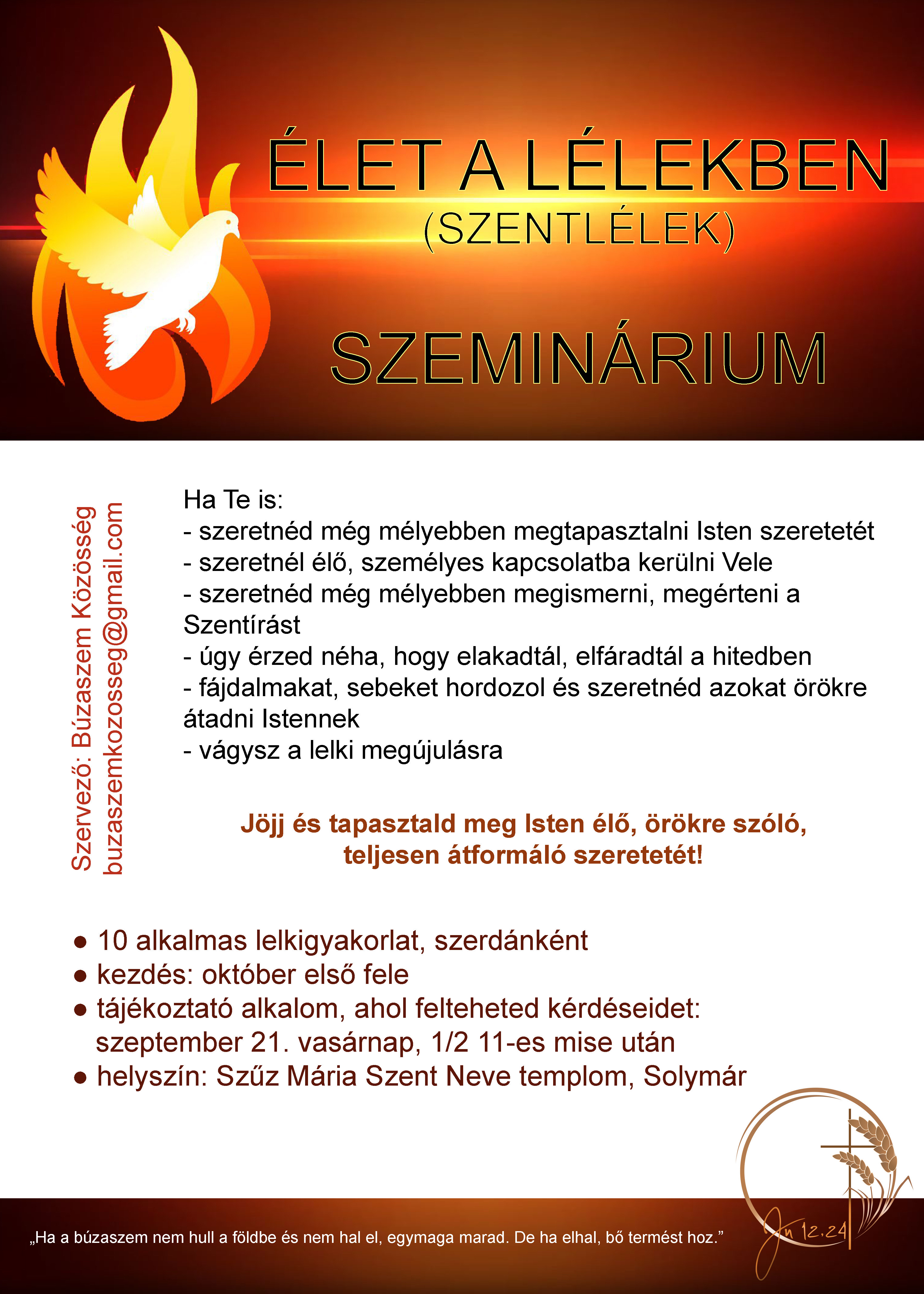A Búzaszem Közösség szervezésében 10 alkalmas Szentlélek szeminárium indul templomunkban.