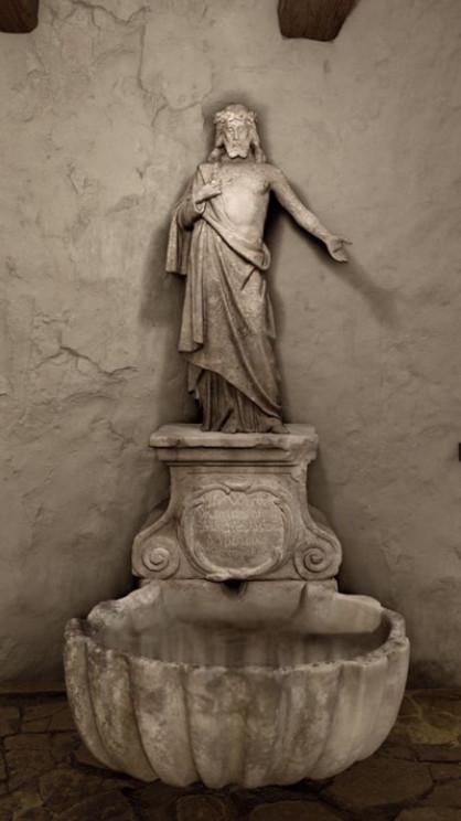 Három részből állt: alul kagyló alakú kőmedence, fölötte szentírási idézettel díszített posztamens, rajta pedig a töviskoronás Krisztus szobra. A kőből faragott Megváltót lehajtott fejjel, mellsebére mutató gesztussal jelenítette meg. A kb. 120 cm magas, töviskoronás Krisztus-ábrázolás oldalából víz fakadt, amely a kagylómedencébe csordogált. Bár a szobor korpusza elveszett, a medence és a posztamens töredékei ma is megtekinthetők a solymári Helytörténeti Gyűjteményben.